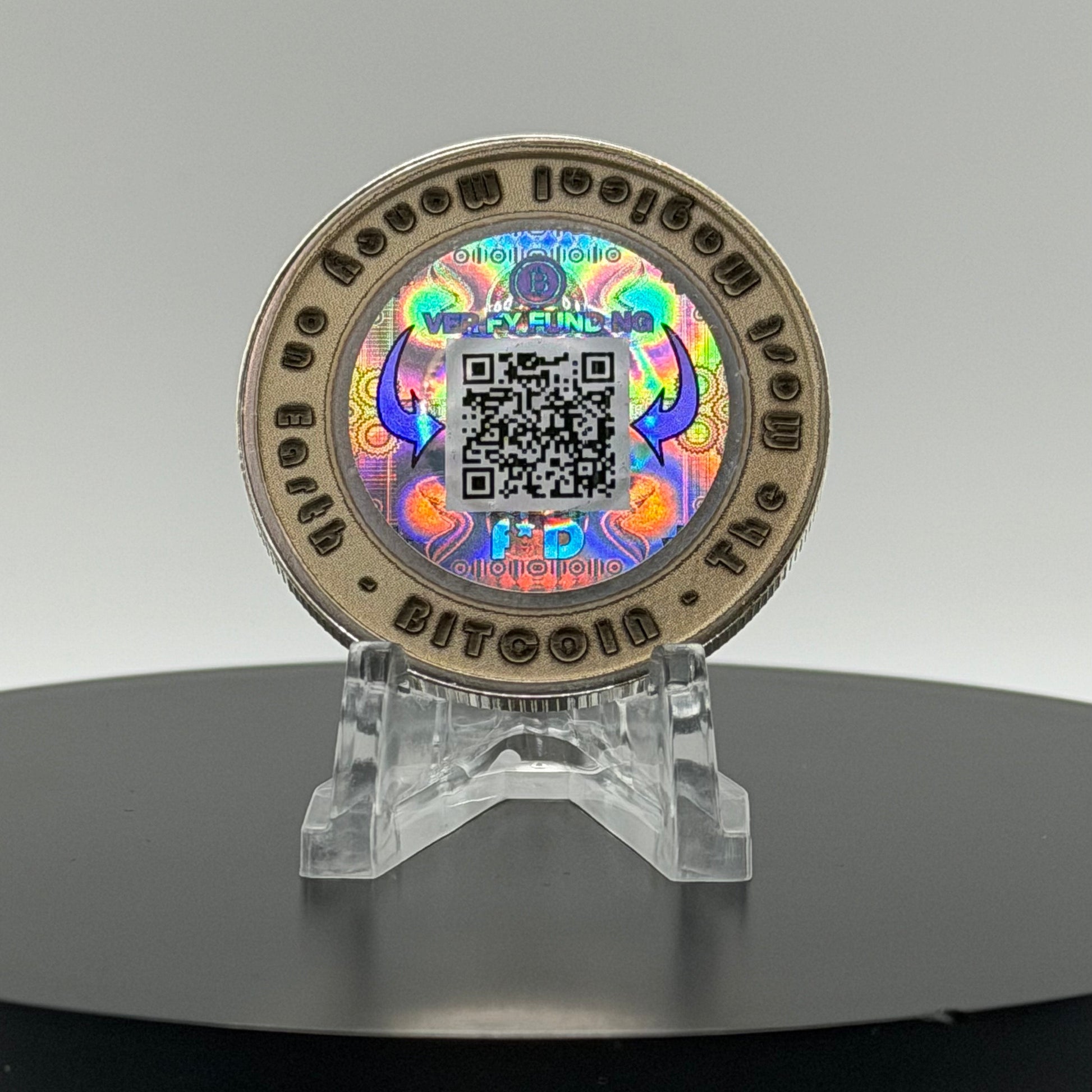 On the reverse, each coin is secured with a custom tamper-evident hologram concealing a one-of-one private key, generated offline in an air-gapped environment.