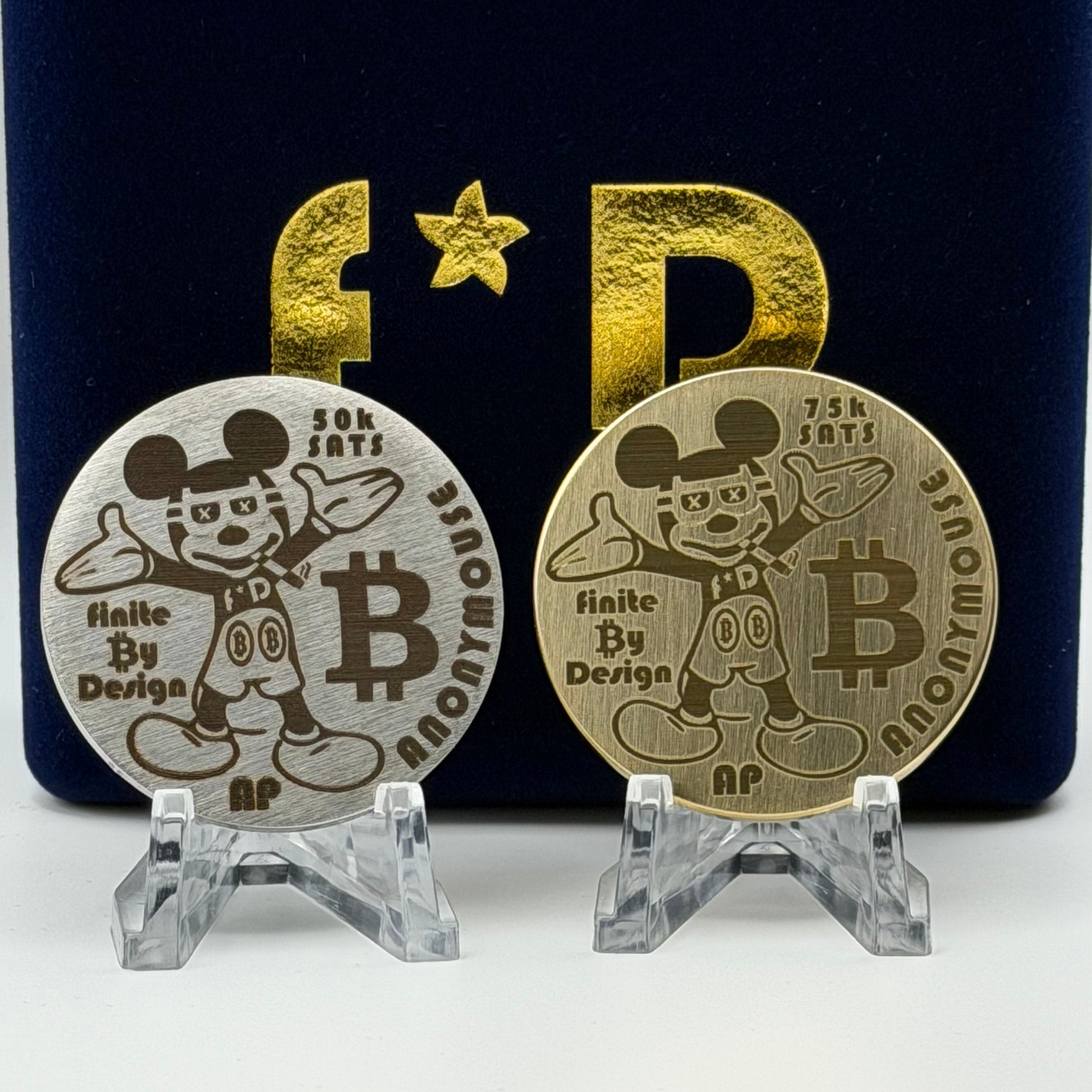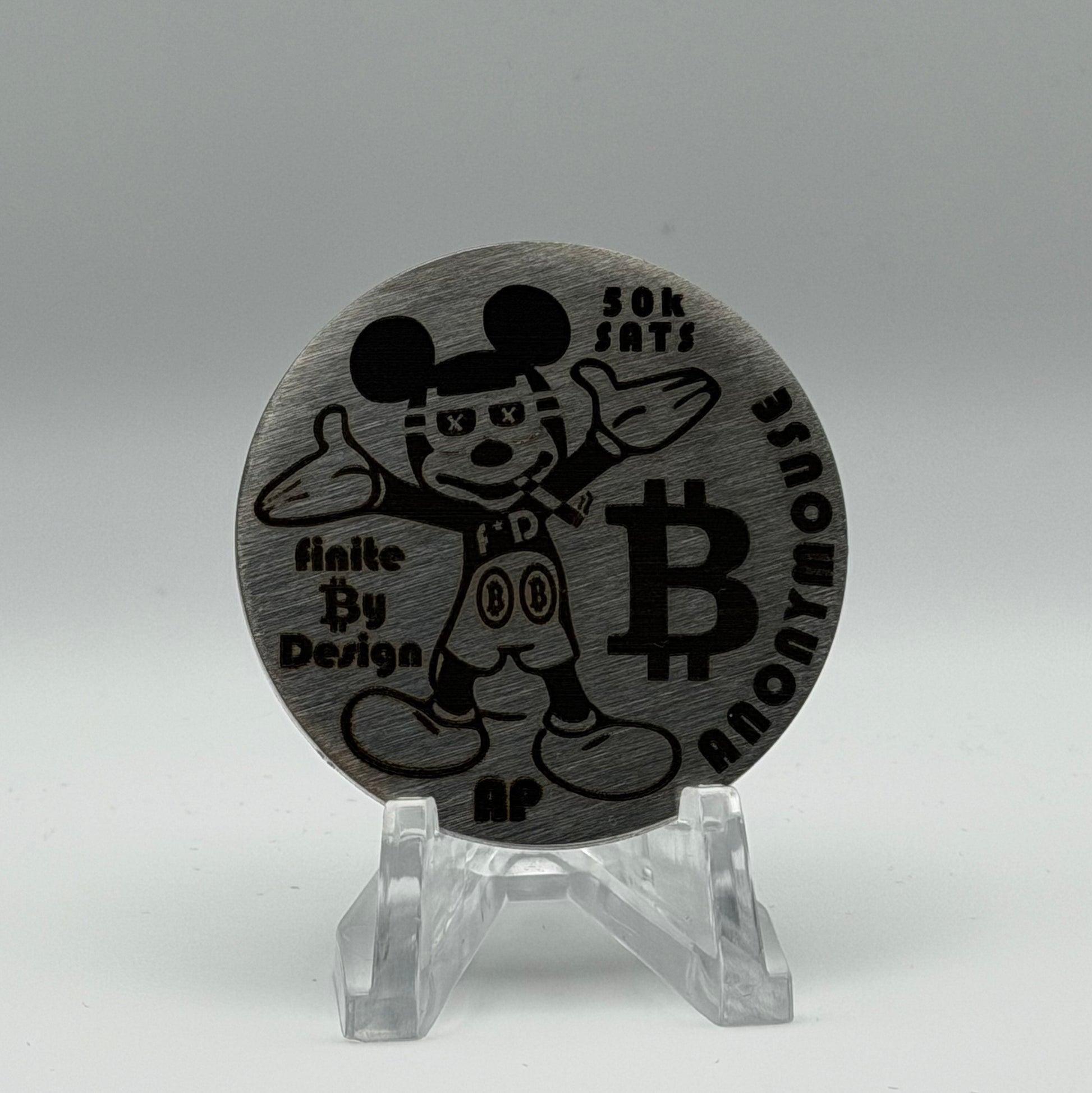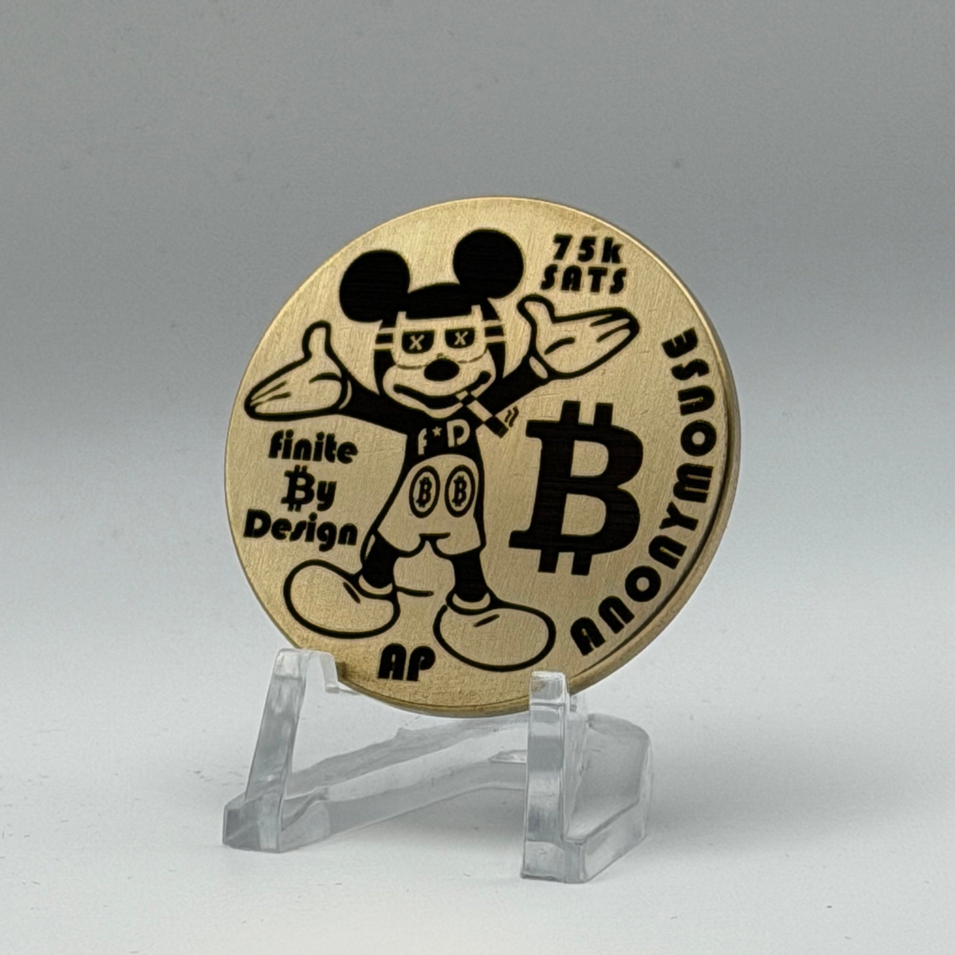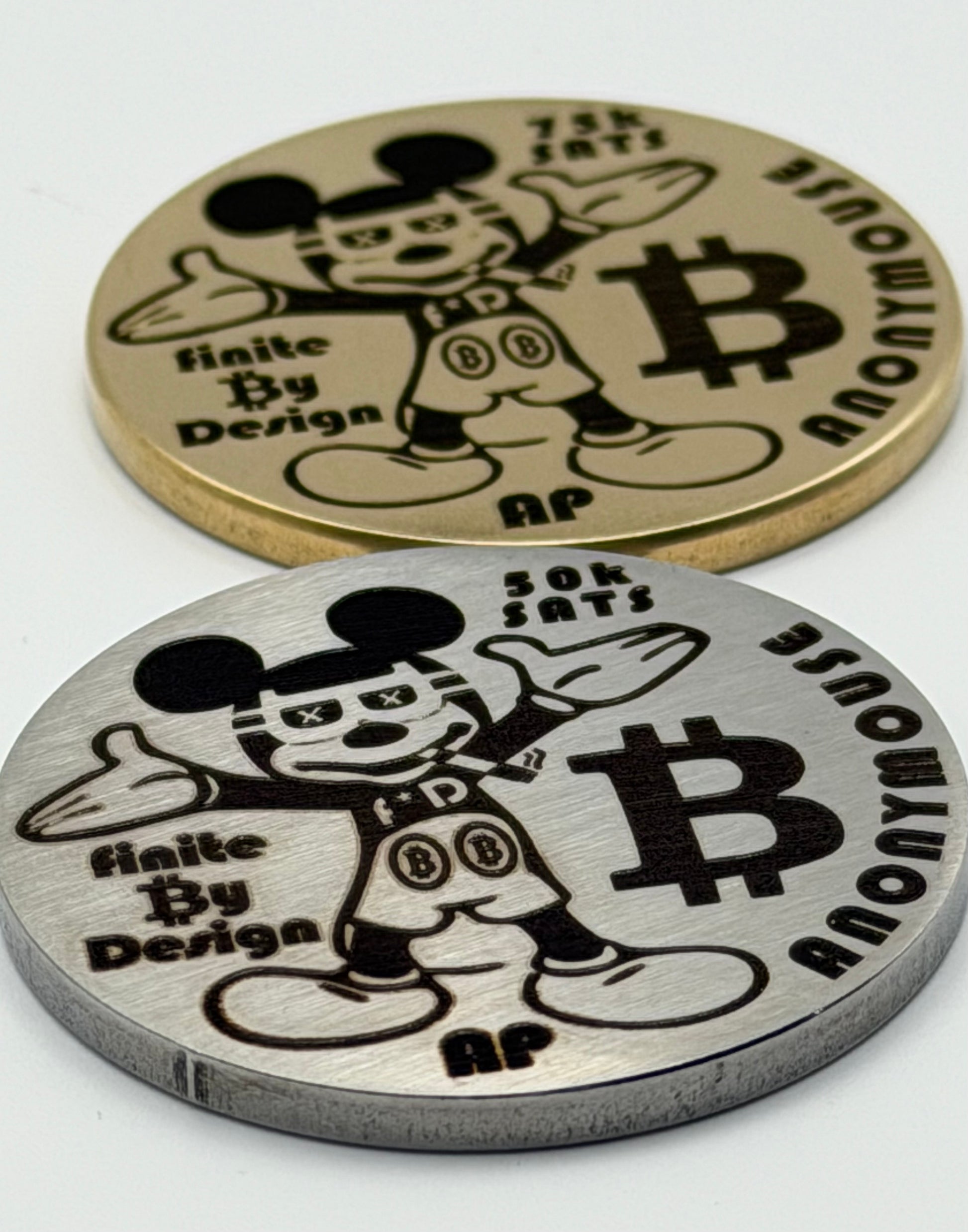 Anonymouse, a two-piece brass and stainless steel coin set is a limited physical artifact of the Bitcoin era—precision laser-engraved, materially honest, and intentionally finite. Designed as a visual time capsule rather than a functional instrument, each set captures crypto symbolism through clean geometry, controlled contrast, and industrial restraint.