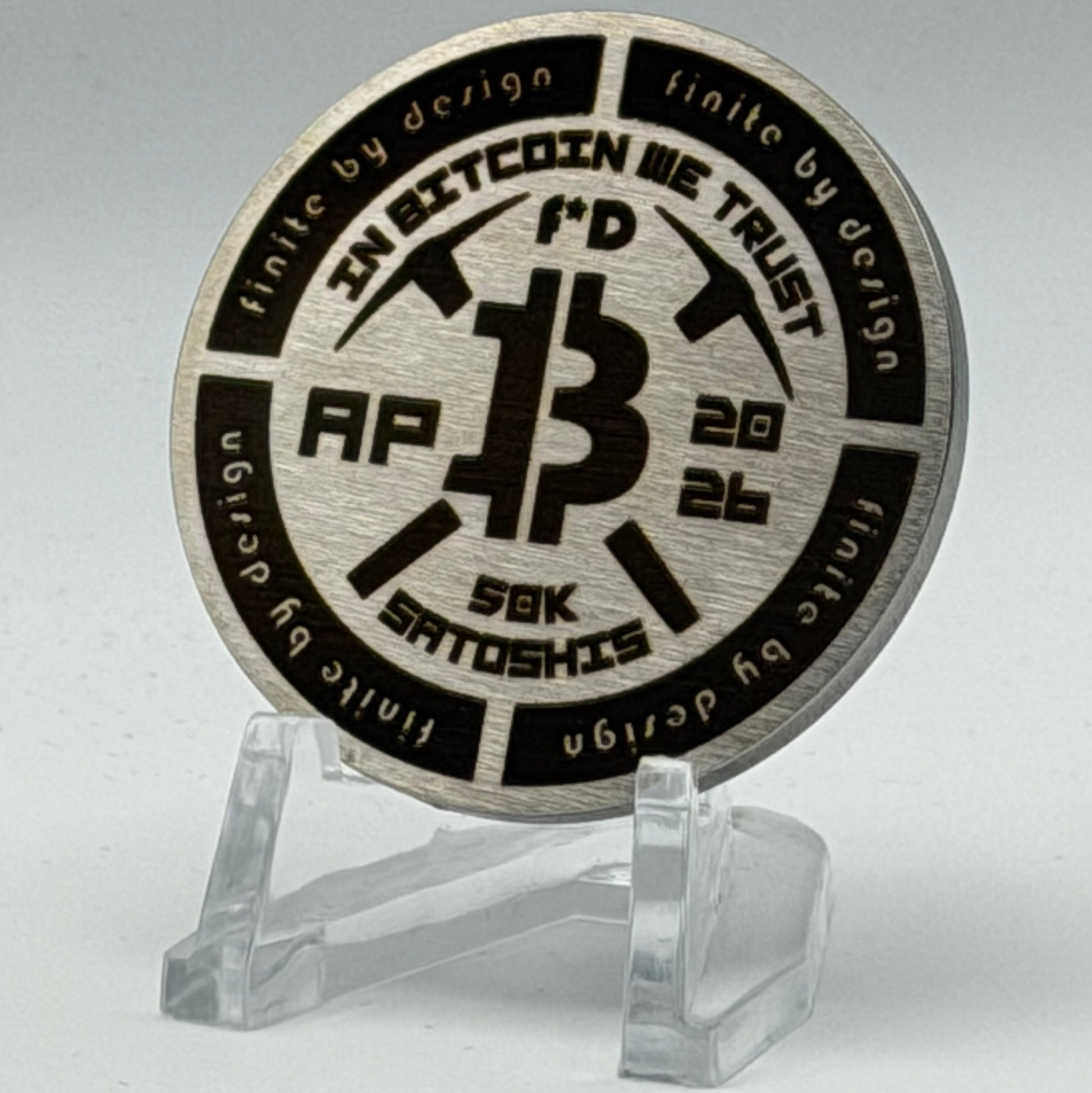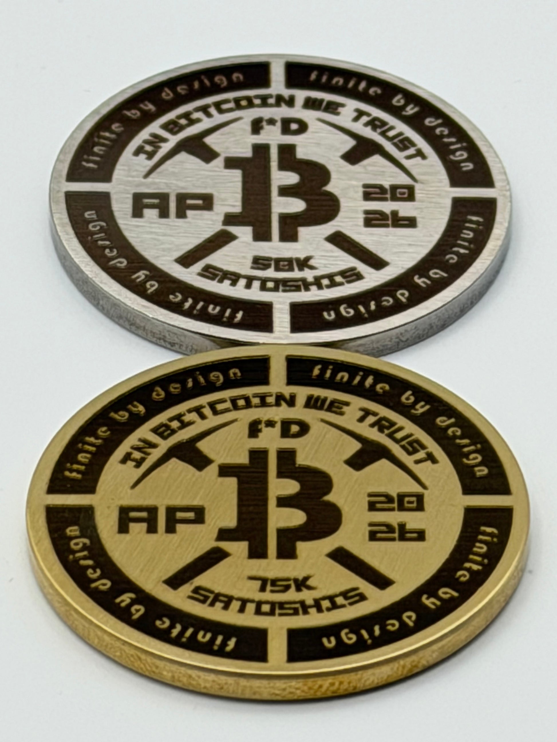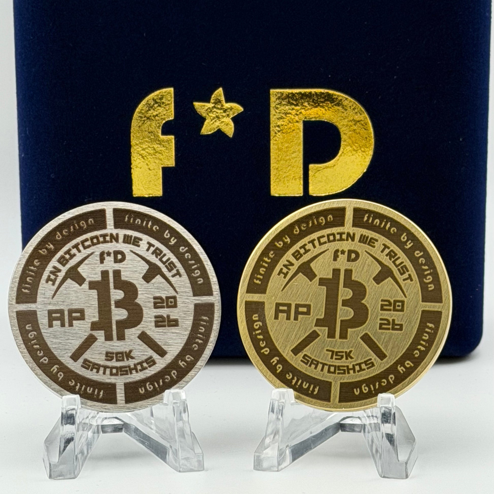 This two-coin brass and steel set stands as a deliberate record of Bitcoin-era conviction—etched, dated, and fixed in metal. Executed entirely in 2D laser engraving, the design prioritizes clarity over ornament, allowing geometry, text, and negative space to define the composition.