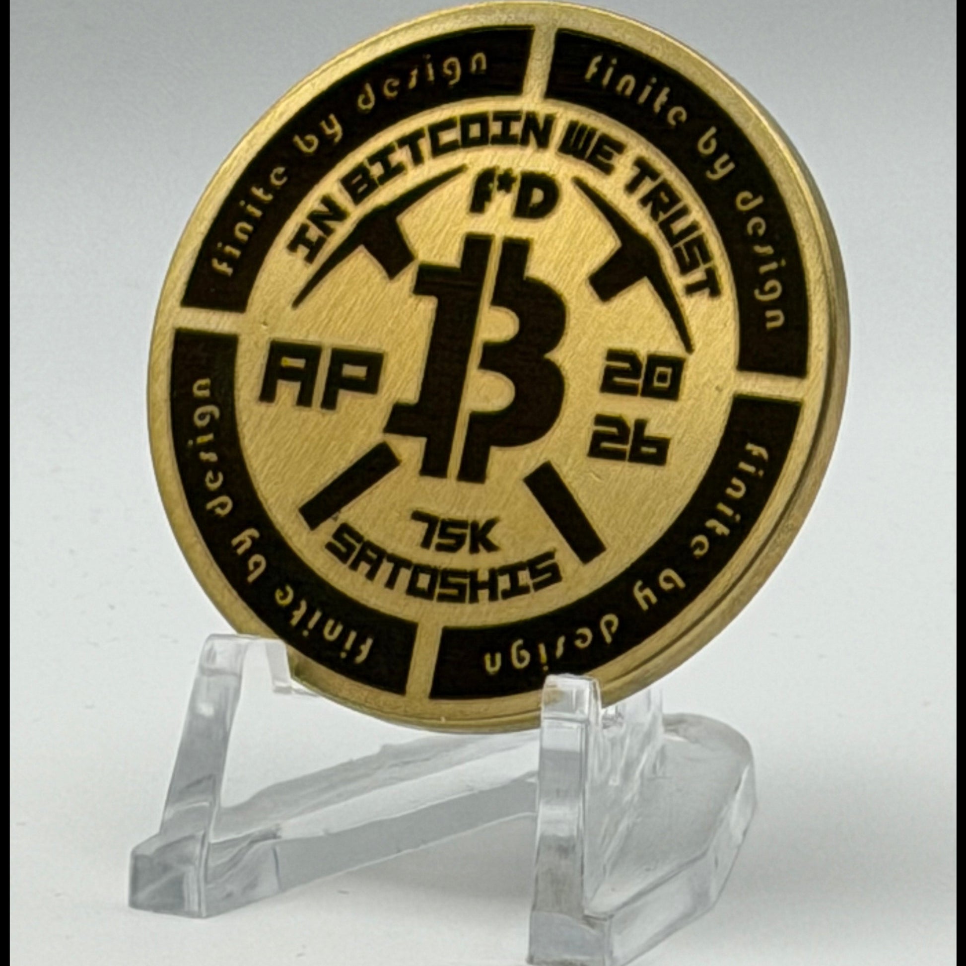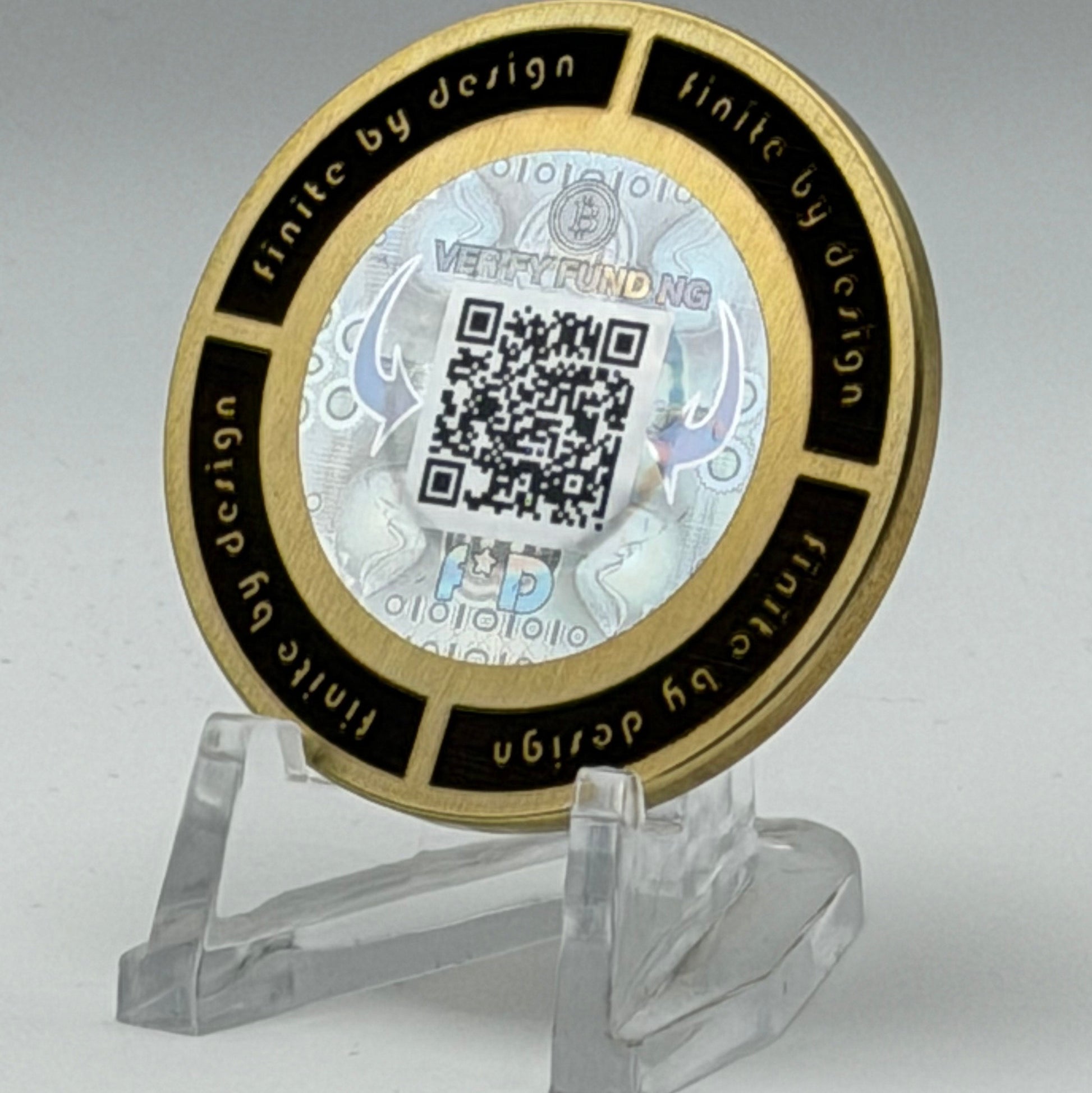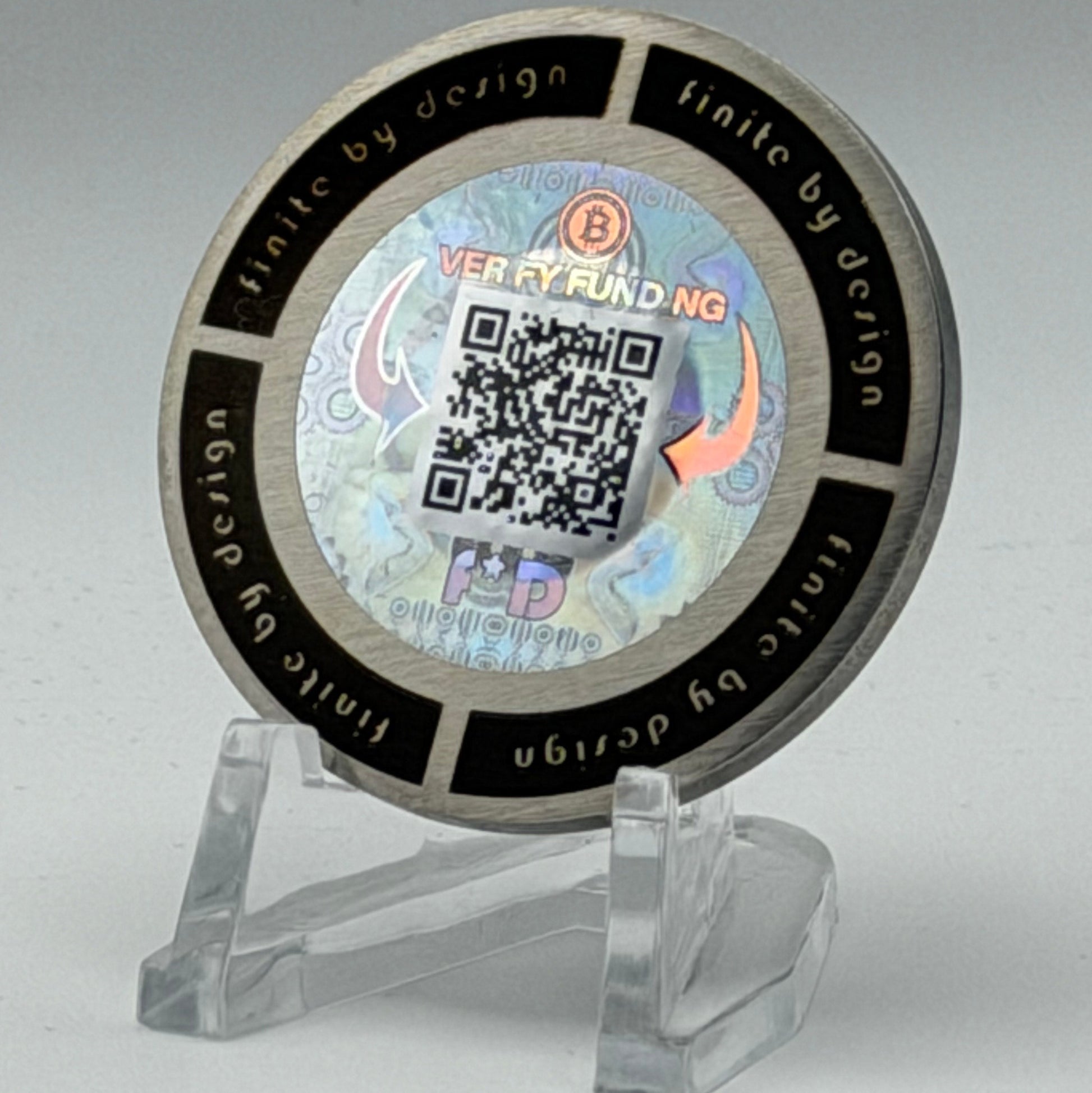 This two-coin brass and steel set stands as a deliberate record of Bitcoin-era conviction—etched, dated, and fixed in metal. Executed entirely in 2D laser engraving, the design prioritizes clarity over ornament, allowing geometry, text, and negative space to define the composition.