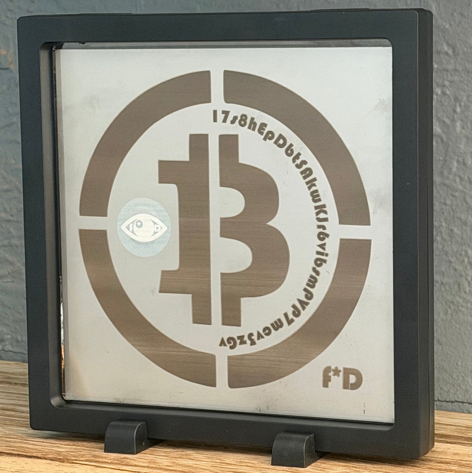 The reverse features a large Bitcoin emblem (f*D's version), encircled by the public funding address corresponding to a unique embedded Bitcoin wallet.