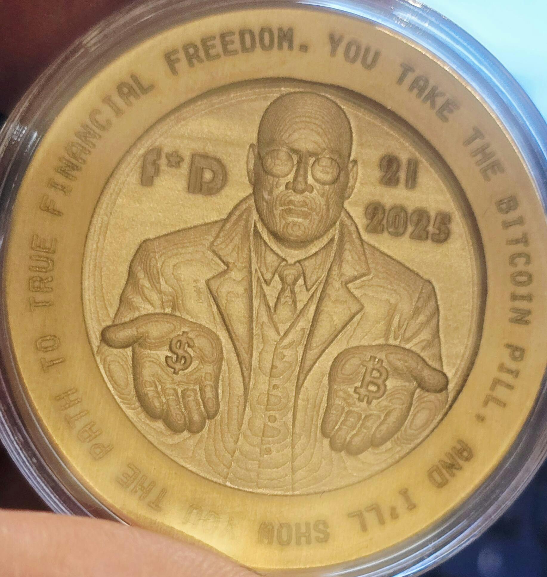 The obverse features Morpheus presenting his timeless choice — one hand offering the dollar sign, the other the Bitcoin symbol — encircled by the phrase: